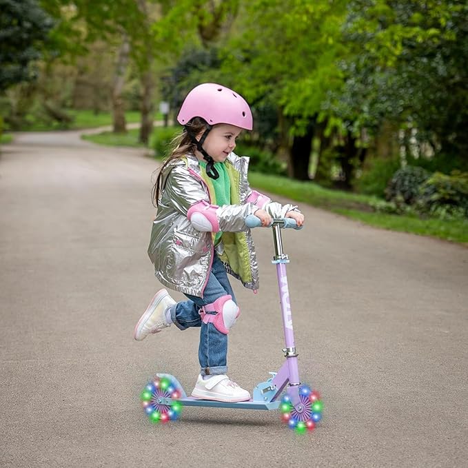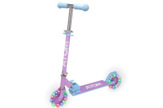 - ATOM Light-Up Inline Scooter – Lilac & Baby Blue | Foldable 2-Wheel Scooter with LED Flashing Wheels | Adjustable Height for Kids Aged 4–7 Get ready to roll in style with the ATOM Light-Up Inline Scooter in stunning lilac and baby blue – the ultimate ride-on for kids aged 4 to 7 years. Whether your child is cruising the park, zipping around the neighbourhood, or practicing their first tricks at the skate park, this sleek and colourful 2-wheel scooter keeps them active, confident, and full of adventure.