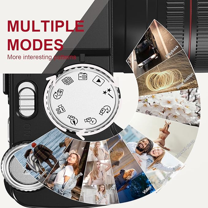 - 【Mode Dial and 2.8-inch 180° Flip IPS Screen】The camera features a 2.8-inch IPS HD screen that rotates 180°, making it perfect for selfies and vlogging. Users can adjust the angle easily to ensure every photo and video is perfectly framed. The camera offers multiple modes, which can be selected via the mode dial: time-lapse for cityscapes or blooming flowers, slow-motion for fun moments, and self-timer for solo travellers who want to capture themselves with scenic backgrounds.